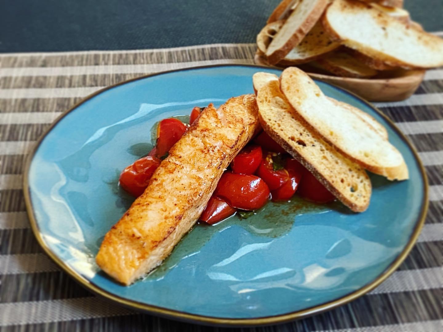 2. Lososa očistíme od šupin nebo odřízneme kůži úplně. Okořeníme ho solí a citronovým pepřem. V pánvi rozehřejeme máslo a lososa na něm osmažíme ze všech stran. Podáváme ho s rajčátky a opečeným pečivem.